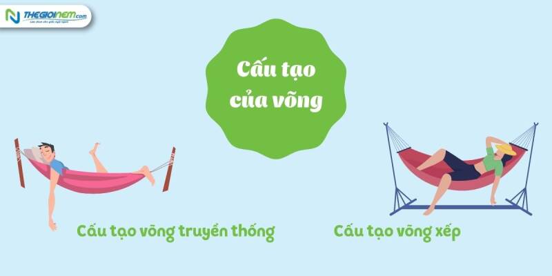 Võng có rất nhiều dạng khác nhau vì vậy cấu tạo của chúng cũng đa dạng theo từng loại. Thông thường có 2 loại võng được rất nhiều người sử dụng là võng truyền thống và võng xếp.