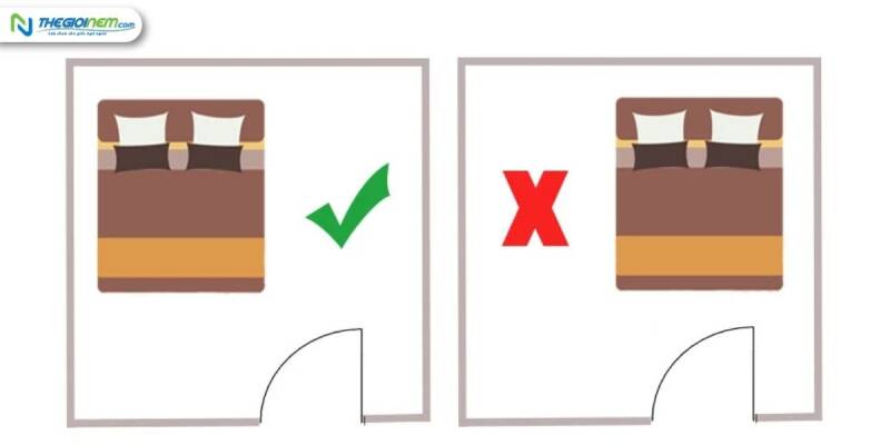• Không ngủ quay đầu vào thẳng với cửa chính của phòng ngủ:Vì sẽ làm tán khí và sát khí xông thẳng vào người nằm, gây nguy hiểm cho sức khỏe và làm suy sụp công danh của gia chủ
